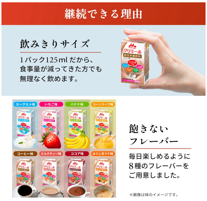 「森永 栄養補助飲料 エンジョイクリミール」は,【少量で高栄養】飲みきりサイズの1本125mlで200kcal。